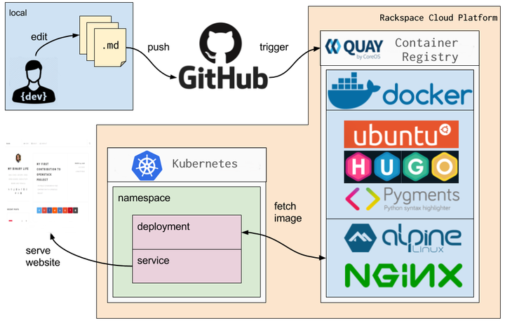 Here are some steps to containerize a blog using hugo + docker + kubernetes + quay